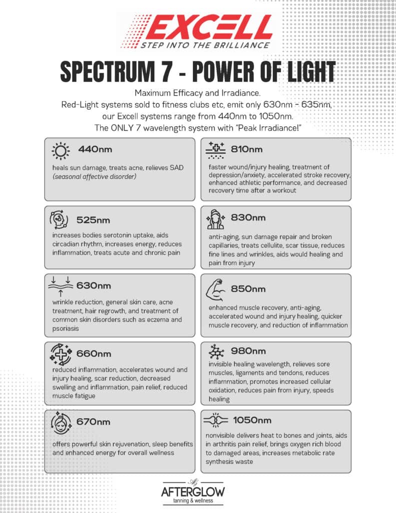 EXCELL has designed systems which use a variety of wavelengths designed to achieve specific outcomes. EXCELL’s technology is backed by over 400 randomized, double blind, placebo controlled clinical studies performed worldwide over the past decade. For example, our Rejuve system focuses primarily on skin rejuvenation and cellular health, whereas our Spectrum system is focused on all aspects of integrating Red Light and Near Infrared from 440nm all the way to 1050 to provide the best overall wellness experience to your customer. As you can see from the following specifications, each EXCELL system uses specific wavelengths to achieve optimum efficacy of treatment.